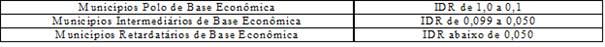 Uma vez determinado o IDR para cada município, é possível ordená-lo segundo o grau de dinamicidade. Os municípios que apresentaram IDR igual ou superior a 0,1 foram classificados como municípios polo de desenvolvimento regional. Apresentam uma dinâmica na sua base produtiva com potencial de crescimento e de consumo. Os municípios cujo IDR se situa no intervalo compreendido entre 0,099 a 0,050 foram considerados intermediários, ou seja, apresentam uma estrutura econômica e social em crescimento, não obstante sua dinâmica ser inferior à dos municípios polo, pois conseguem atrair recursos e renda dos municípios retardatários. Os municípios com IDR abaixo de 0,050 foram considerados retardatários, sem qualquer capacidade de implementar um processo de crescimento e desenvolvimento econômico, pois não conseguem reter nem atrair recursos de forma a assegurar as condições mínimas de um processo de desenvolvimento regional.