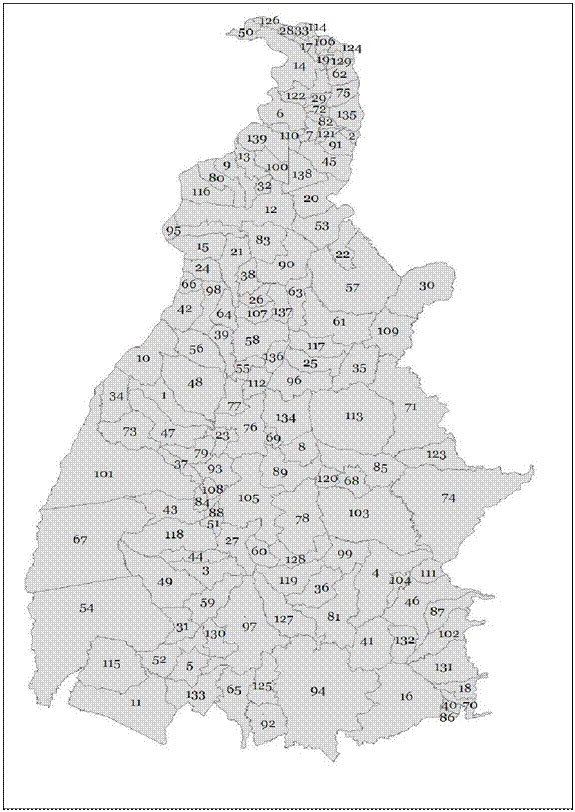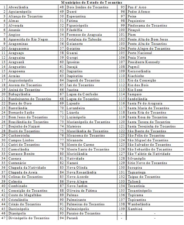 A construção do Índice de Desenvolvimento Regional (IDR) foi necessária para a ordenação dos dados e informações referentes aos 139 municípios tocantinenses. Como o objetivo é medir a evolução do processo de desenvolvimento regional e a dinaminicidade dos municípios, os dados foram coletados em 2000 e 2010. A Figura 2 mostra a localização dos 139 municípios do Estado do Tocantins, com sua respectiva numeração, que corresponde a cada município elencado na Tabela 1.
