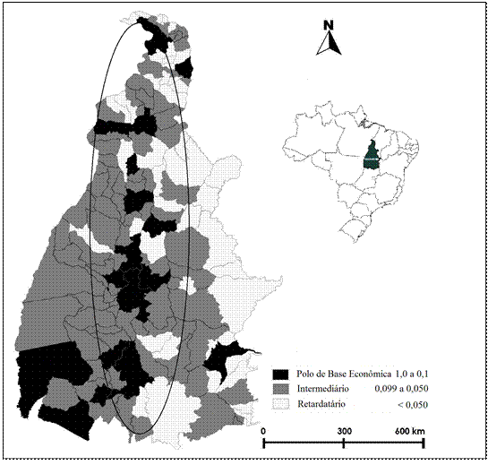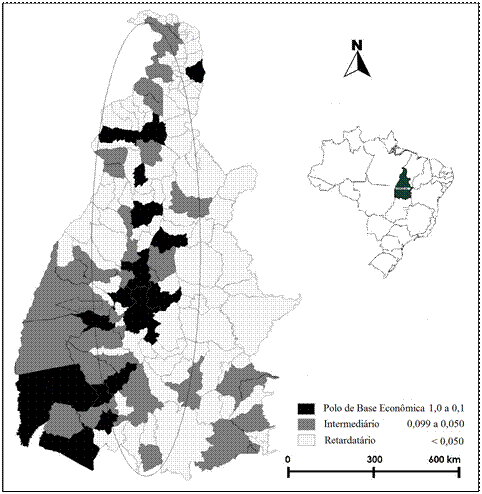 A Figura 4 assim como a Figura 3 mostram predominância da concentração dos municípios polo ao longo da rodovia BR-153 (Belém-Brasília). Os municípios polo acabam irradiando o processo de desenvolvimento para os municípios intermediários, e esses, por sua vez, para os retardatários.