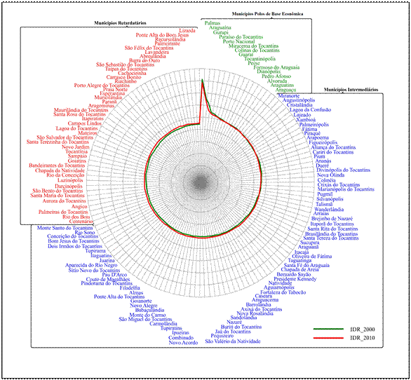 Nesse sentido, houve crescimento desequilibrado e concentrado em apenas três municípios - Palmas, Araguaína e Gurupi - todavia, está havendo um transbordamento para cidades mais próximas dos polos regionais de base econômica, redução dos municípios considerados retardatários, conforme mostrou o IDR de 2000 para 2010.