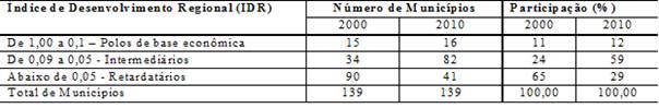 A partir de 2010, verificou-se melhora sensível do IDR: os municípios polo de base econômica passaram a ser 16; os municípios intermediários passaram de 34 em 2000 para 82 em 2010, correspondendo a 59% do total do estado. O grande avanço ocorreu nos municípios classificados como retardatários de base econômica, que passaram de 90 em 2000 para 41 municípios em 2010, isto é, 49 municípios passaram a ser considerados intermediários. A participação percentual dos municípios considerados retardatários, que era de 65% em 2000, caiu para 29%.