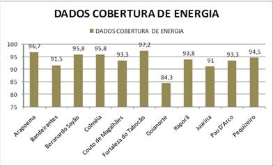 Quanto ao acesso à energia elétrica nas propriedades, apesar dos inúmeros programas para disponibilização integral à todas as propriedades, como o Programa Luz Para Todos e o Programa de Eletrificação Rural, o acesso ainda não é uma realidade para 100% das propriedades. O gráfico (figura 3) disponibilizado pelo PTDRS apresenta o alcance da energia elétrica para todos os municípios do território Médio Araguaia.