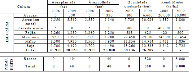 Foi observado que a cultura do milho apesar de ter sofrido uma queda de 7,18%, permanece sendo a cultura temporária de maior área plantada no território. O município com maior incidência dessa cultura é o de Colméia. A segunda cultura de maior área plantada é a soja, sendo predominante no município de Fortaleza do Tabocão, representando 47% da área total plantada no território.