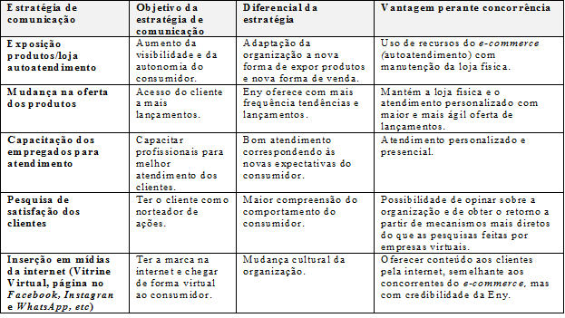 Assim, as Lojas Eny buscam se manter no mercado e ter vantagens perante a concorrência, especialmente a virtual, reforçando o que as caracterizam, adequando as estratégias de vendas e de comunicação aos interesses do consumidor e com ferramentas que até então não utilizadas.