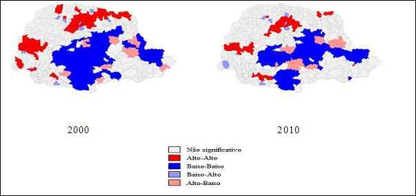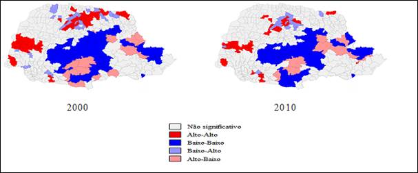 A variável PIB per capita, por sua vez, demonstra estar menos autocorrelacionada espacialmente, com menor número de clusters AA e BB, confirmando resultado presente no diagrama de dispersão de Moran. Regiões AA (15) em 2000 passam para (8) em 2010. Regiões BB também passam a diminuir no período analisado, passando de 42 em 2000 para 39 em 2010. Já as regiões BA se mantém com 15 municípios e as regiões AB passam de 2 municípios em 2000 para 5 em 2010. Nesse caso, em 2010 a variável passa a ser a menos autocorrelacionada do estado, porém, por outro lado, perde algumas de suas regiões mais desenvolvidas, mantendo um alto número de regiões subdesenvolvidas (39) que devem receber maior atenção no sentido de políticas públicas, ademais observam-se mais regiões autocorrelacionadas negativamente, indicando outliers.