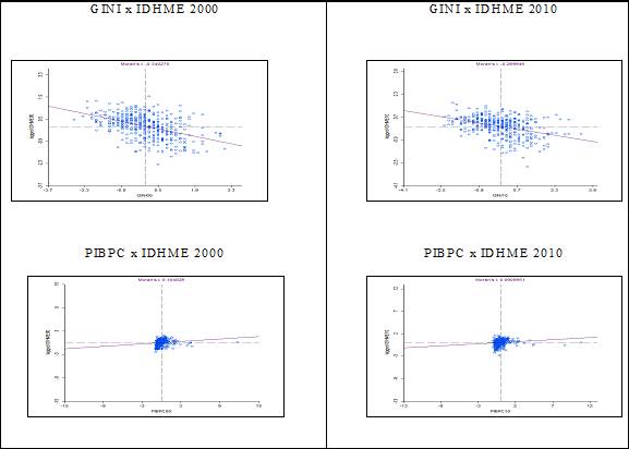 A Figura 7 mostra os diagramas de dispersão de Moran, que confirmam os resultados da estatística I de Moran, tendo o diagrama de GINI x IDHME uma reta negativamente inclinada e uma reta positivamente inclinada para as variáveis PIBPC x IDHME.