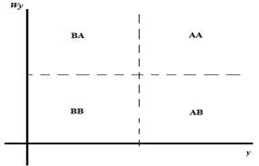 e Wy (variável em análise defasada espacialmente), através do gráfico de duas variáveis. Segundo Almeida, Perobelli e Ferreira (2008) trata-se de uma representação do coeficiente de regressão. O diagrama é dividido nos 4 quadrantes (AA, BB, AB e BA)[8], como mostra a Figura 1.
