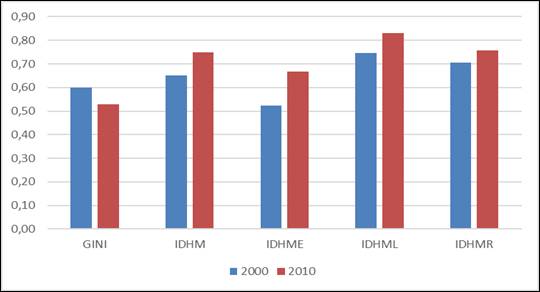 De acordo com Figura 2, o índice de Gini diminui de 0,6 para 0,53. Ou seja, houve redução da desigualdade de renda domiciliar per capita no estado como um todo. Além disso, o IDHM aumentou em todas as suas dimensões, mostrando que houve um aumento do desenvolvimento no estado. O IDHM geral neste ano foi de 0,749 e classifica o estado como de alto índice de desenvolvimento humano. Porém, apesar de o IDHM da educação ter aumentado aproximadamente 28%, ainda é o mais baixo dentre as três dimensões, sendo o único classificado como médio.