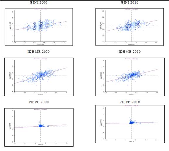 Concernente à análise dos diagramas de dispersão de Moran, há uma confirmação de autocorrelação nos dados, sendo a reta positivamente inclinada quando os dados apresentam autocorrelação positiva e negativamente inclinada quando apresentam autocorrelação negativa. A autocorrelação positiva significa que os municípios de baixo (alto) valor da variável em relação à média são cercados por municípios também de baixo (alto) valor da variável em relação à média. Já a autocorrelação negativa significa que municípios de baixo (alto) valor da variável em relação à média são cercados por municípios de alto (baixo) valor da variável em relação à média. Assim, GINI, IDHME e PIBPC mantém seu padrão de associação espacial global na década, mantendo a maioria dos municípios nos quadrantes BB e AA, concentrando regiões mais e menos desenvolvidas. Cabe destacar que a variável PIBPC apesar de manter seu padrão de associação espacial durante a década, apresenta diminuição da inclinação da reta, demonstrando diminuição de autocorrelação espacial nos dados.