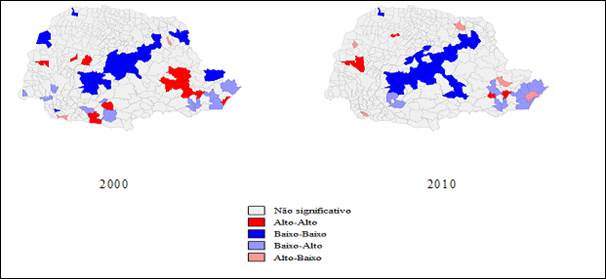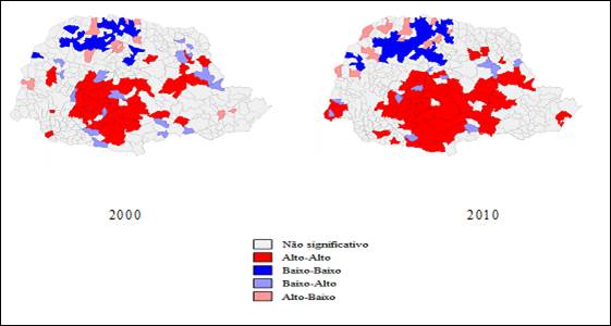 No caso do Paraná, Lima, Caldarelli e Camara (2014) analisam o desenvolvimento municipal no estado na década de 2000, utilizando AEDE e dados do Índice de desenvolvimento municipal da FIRJAN – IFDM – em suas três dimensões – Emprego e Renda, Educação e Saúde. Constataram concentração espacial e clusters de alto e baixo desenvolvimento em diferentes regiões do estado. Sendo, no geral, os clusters de alto desenvolvimento concentrados nas regiões: Norte Central, Oeste e Metropolitana de Curitiba, e os de baixo desenvolvimento nas regiões: Central e Leste do estado.