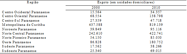Outros dados importantes para avaliação do progresso do desenvolvimento e qualidade de vida dos paranaenses são os de saneamento. Nesse caso, utilizou-se o número de unidades atendidas de esgoto nas regiões paranaenses. A Tabela 1 mostra a evolução do número de unidades atendidas em relação ao fornecimento de esgoto. Infere-se que no estado como um todo houve um aumento de 90,16% no provimento deste serviço. Importante frisar que as regiões com maior aumento foram Centro ocidental Paranaense, Noroeste Paranaense e Sudeste Paranaense, regiões de pouca importância econômica e que apresentam os menores indicadores de produto e renda. Assim, a evolução na década parece incluir regiões mais pobres melhorando a qualidade de vida das pessoas, na média.