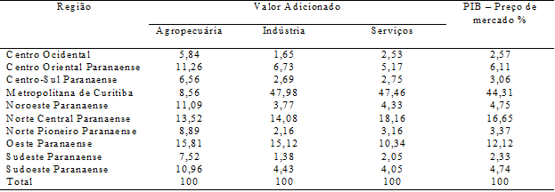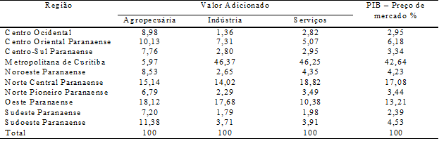Concernente as variáveis econômicas, a Tabela 2 apresenta a distribuição do valor adicionado do PIB – por setor – nas regiões do estado do Paraná para o ano de 2000.