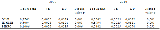 Como mostra a Tabela 4, o I de Moran é maior que o valor esperado em todas as variáveis indicando assim, associação espacial positiva nos dados. Além disso, os valores são estatisticamente significativos, sendo o maior pseudo valor-p ocorrido na variável PIBPC no ano 2010.