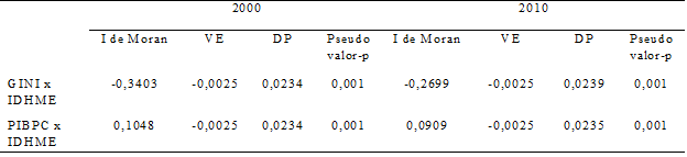 A Tabela 5 traz os resultados do I de Moran para as variáveis Gini x IDHME defasado espacialmente, o valor da estatística está abaixo de seu valor esperado, evidenciando uma autocorrelação espacial negativa entre as variáveis, ou seja, municípios com alto índice de gini são cercados por outros de baixo índice de desenvolvimento (educação), e municípios com baixo índice de gini (menor desigualdade) são cercados por outros de alto índice de capital humano, indicando assim, que o capital humano defasado espacialmente pode influenciar as concentrações espaciais de desigualdade renda per capita nos municípios analisados. A Tabela 5 também mostra as estatísticas para as variáveis PIBPC x IDHME. Em contraste, essas apresentam autocorrelação espacial positiva nos dados, porém, em 2010 a variável passa a apresentar uma menor autocorrelação espacial global nos dados.