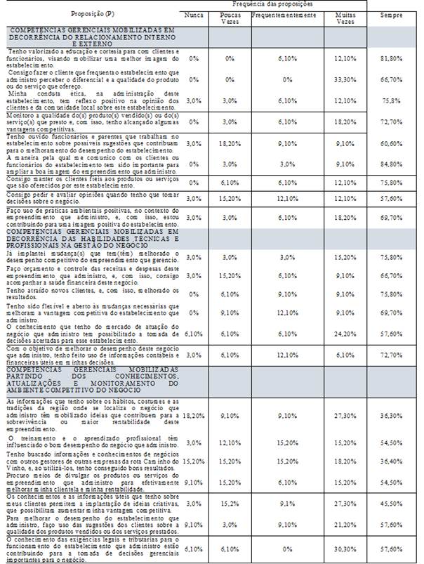 Pelos dados do Anexo A constatou-se, pelas frequências em percentuais encontradas para cada uma das variáveis analisadas neste estudo, que as competências gerenciais avaliadas são satisfatoriamente atendidas nas práticas da gestão desses gestores. Por categoria, evidenciou-se, nas competências gerenciais mobilizadas em decorrência do relacionamento interno e externo, que a mais praticada, em termos de percentuais, foi a que o gestor consegue fazer o cliente que frequenta o estabelecimento perceber o diferencial e a qualidade do produto ou do serviço que oferece. Essas empresas, por terem uma estrutura menos hierarquizada, possibilitam um contato mais próximo com o cliente, principalmente para ouvir o que ele tem a dizer sobre o produto ou serviço oferecido e o que pode ser melhorado, podendo tornar-se, este detalhe, quando bem aproveitado, uma vantagem competitiva (FLEURY; FLEURY, 2011). Por outro lado, ainda com relação a essa primeira categoria, os itens que menos se destacaram, em termos de percentuais, na soma das colunas dos concordantes (Anexo A), foram. se eles ouvem funcionários e parentes que trabalham no estabelecimento e se pedem e avaliam opiniões para a tomada de decisões sobre o negócio. Justificava-se a pouca valorização dessas competências, porque, segundo Ferreira et al. (2012), a centralização das decisões na pessoa do proprietário, é uma das características fortes nas MPE.