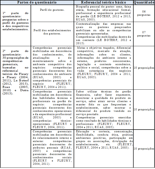 Na análise da fidedignidade das competências avaliadas, recorreu-se ao alfa de Cronbach, que determina o quanto os itens de uma escala estão inter-relacionados. De maneira geral, considera-se que uma escala tem boa consistência quando os valores de alfa são iguais ou superiores a 0,70 (HAIR et al., 2010). Esse instrumento de pesquisa foi estruturado em duas partes: a primeira composta por perguntas gerais sobre o perfil do gestor e também do seu empreendimento, com o objetivo de levantar algumas características locais gerais. A segunda, constituída por uma escala Likert de 1 a 5 pontos, em que o respondente tinha de escolher, para cada um dos itens apresentados, em que medida a competência gerencial é utilizada no desempenho das funções do gestor, segundo sua própria percepção, contemplava 30 variáveis que foram distribuídas em três categorias, de acordo com o referencial teórico adotado de Le Boterf (2012 e 2015), Fleury e Fleury (2004 e 2011), Ruas (2005 e 2010) e Dutra (2013). O Anexo B resumiu a composição completa do questionário adotado com sua base teórica.
