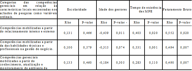 De acordo com a Tabela 1, na aplicação do teste de correlação de Spearman, entre as variáveis ordinais, escolaridade, idade dos gestores, tempo de existência das MPE no local e faturamento bruto e as três categorias de competências gerenciais apresentadas e avaliadas pelos gestores, chegou-se aos seguintes resultados: