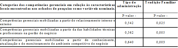 Na aplicação do teste de qui-quadrado, para avaliar a associação entre duas variáveis qualitativas, se uma delas for nominal (CUKIER; SILVA, 2012) e no caso em questão, as variáveis nominais foram o tipo de administração e os motivos para abertura do empreendimento seguindo a tradição familiar, (tabela 2), os valores resultantes não puderam ser validados na medida em que foi violado um dos pressupostos de sua aplicação, isto é, não mais do que 20% das células devem ter frequência esperada inferior a 5 (MALHOTRA, 2012). Em razão disso, ele foi substituído pelo exato de Fisher. Conclui-se (p-valor inferior a 0,05), que há relação entre a variável tradição familiar e a mobilização das três categorias de competências gerenciais pelos gestores das MPE da rota turística rural Caminho do Vinho. Assim, confirma-se que as competências do gestor também se materializam, em sua prática, alicerçadas, segundo Le Boterf (2012 e 2015), no contexto local (tradição familiar) em que elas foram mobilizadas.