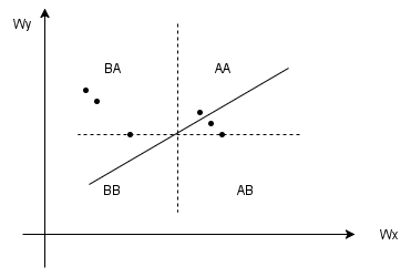 O diagrama fornece muitas informações, tais como quadrantes representando quatro tipos de associação linear espacial, sendo Alto-Alto, Baixo-Baixo, Alto-Baixo e Baixo-Alto. Na Figura 1 tem-se o exemplo do gráfico de dispersão I de Moran.