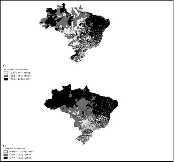 A Figura 2 contêm os mapas de quantile da taxa de cobertura e taxa de pobreza, sendo dividido em três intervalos. Percebe-se que a região do Nordeste há uma grande taxa de pobreza no ano de 2010 e também alta taxa de cobertura, logo nesta região o programa está focalizado. Na região Norte está elevada a taxa de pobreza, porém a taxa de cobertura não segue essa elevação, o que torna necessário elevar o programa nesta região para amenizar a pobreza das famílias. A região Norte é composta pelo segundo estrato no mapa da taxa de cobertura, variando de 60,5% a 75,8% e pelo terceiro estrato no mapa da taxa de pobreza, com variação entre 3,88% a 17,7%.