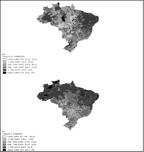 Na Figura 3b encontra-se os mapas Box-Map, com hinge 1.5, das taxas de pobreza e cobertura. É possível visualizar nos mapas, que 19 municípios são outliers globais superiores da taxa de pobreza, ou seja, 19 municípios apresentam elevadas taxas de pobrezas em relação aos demais municípios. Estes municípios estão localizados nos estados do Acre, Amazonas, Maranhão, Piauí, Roraima. Na Figura 3a tem-se a taxa de cobertura, na qual 13 municípios são outliers superiores, estando localizados nos estados de Bahia, Maranhão, Pará, Paraná, Pernambuco, Piauí, Rio Grande do Sul, São Paulo.