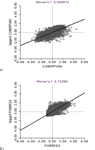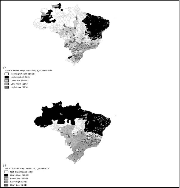 Com as matrizes de ponderações espaciais definidas para as variáveis taxa de cobertura e taxa de pobreza, a Figura 4 apresenta as estatísticas I de Moran Local para tais variáveis. Pela Figura 4 percebe-se que ambas estatísticas foram positivas, tanto a taxa de cobertura quanto a taxa de pobreza, apresentando autocorrelação espacial positiva, altos (baixos) valores da taxa de cobertura e taxa de pobreza estão circundados por altos (baixos) valores destas variáveis nas regiões vizinhas. O p-valor da estatística I de Moran com 999 permutações, para a variável cobertura e a variável taxa de pobreza é igual a 0,001, ou seja, significativos ao nível de 5%.