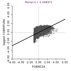 Na Figura 5 apresenta à estatística I de Moran bivariado, sendo a variável dependente a taxa de cobertura e a explicativa taxa de pobreza. O resultado de 0,49 apontou que as taxas apresentam autocorrelação positiva, ou seja, altos (baixos) valores da taxa de cobertura estão circundados por altos (baixos) valores da variável taxa de pobreza nas regiões vizinhas. O valor da estatística foi significativo ao nível de 5%, sendo o p-valor igual 0,001.