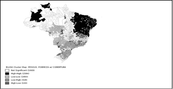 O mapa de cluster LISA bivariado da taxa de cobertura e da taxa de pobreza estão representados na Figura 7, onde as variáveis apresentam padrões locais de autocorrelação espacial positiva. Pelo mapa de cluster observa-se que a grande parte dos municípios apresenta associação espacial baixa-baixa das taxas de cobertura e pobreza, sendo no total 1883 municípios localizados nas regiões Sul, Sudeste e Centro-Oeste, sendo estas regiões mais ricas economicamente. Analisando associação alto-alto, percebe-se que a maioria dos 1584 municípios estão na região Norte e Nordeste, sendo, portanto, as regiões em que municípios com altas taxas de pobreza são circundados por municípios com alta taxa de cobertura do programa Bolsa Família.