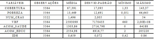 Os dados foram retirados no site do MDS, porém a taxa de pobreza não existe, para fazê-la realizou-se a divisão da estimativa da população em extrema pobreza pela população total. Esta variável tem o intuito de identificar as famílias mais pobres elegíveis para o programa, onde espera-se que quanto maior a taxa de pobreza em uma determinada localidade maior deva ser a taxa de cobertura do programa. O modelo do estudo terá como variável dependente a taxa de cobertura do programa Bolsa Família e as variáveis explicativas são a taxa de pobreza, número de CRAS, valor do programa Bolsa Família repassado para os municípios, acompanhamento saúde, acompanhamento educação e Índice de Desenvolvimento Humano.