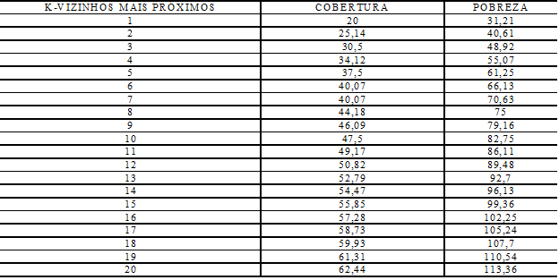 Para prosseguir a análise, foi necessário definir uma matriz de ponderação espacial para as variáveis taxa de cobertura do programa Bolsa Família e taxa de pobreza. Optou-se em utilizar a matriz de k-vizinhos, segundo procedimento de Baumont, Ertur e Gallo (2004). Na Tabela 2 temos os valores do I de Moran para as variáveis taxa de cobertura e taxa de pobreza, usando k-vizinhos mais próximos variando 1 £ k £ 20. Pelos valores das estatísticas I de Moran, os 20 vizinhos mais próximos das variáveis taxa de cobertura e taxa de pobreza, possuem o valor da estatística respectivamente 54,47 e 96,13.
