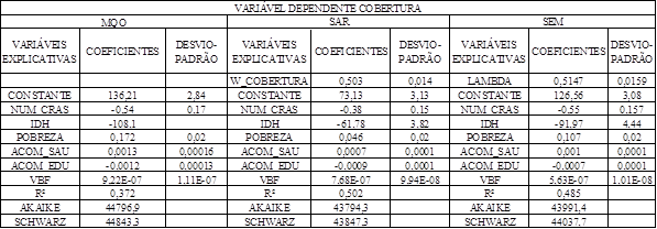 Na Tabela 3 contêm os modelos MQO, SAR e SEM para a variável dependente taxa de cobertura do programa Bolsa Família. Pela tabela verifica-se que nos três modelos os sinais das variáveis foram iguais. No modelo SAR, observado na Tabela 3, a variável W_COBERTURA é a defasagem espacial da variável dependente, sendo positiva e significativa ao nível de significância de 1%. Este modelo informa que a variável taxa de cobertura é influencia pela taxa de cobertura das regiões vizinhas. No modelo SEM tem o LAMBDA que acompanha a defasagem Wξ, sendo significativo ao nível de 1% e com sinal positivo, mostra que os erros estão associados com a média dos erros das regiões vizinhas.