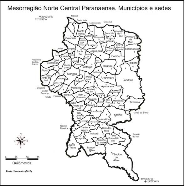 A região Norte Central paranaense, recorte espacial deste artigo, é composta por 79 municípios, correspondendo, segundo o IBGE (2010), a uma área de pouco mais de 12 mil km² (12% do Paraná) e a 2.037.151 habitantes (19% da população do Estado). A abordagem regional atende à preocupação de não tratar localidades isoladas como se fossem exclusivas. Os problemas aqui levantados atingem com maior intensidade algumas localidades, mas como tendência observa-se que as localidades da região e do Paraná, de forma geral, são atingidas igualmente.