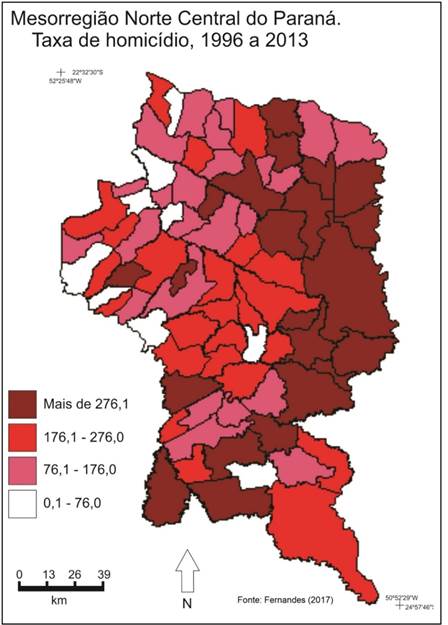 A partir das taxas de homicídios apresentadas por Fernandes (2017) é possível comparar e promover reflexões acerca desses dados com os fatos divulgados pela mídia no Norte Central paranaense. Segundo Fernandes (2017), a maioria dos municípios que compõem o Norte do Estado do Paraná vive em estado de emergência, com epidemias de violência, já que superam a taxa de homicídios tolerada pela Organização das Nações Unidas (ONU). A Figura 5 apresenta os municípios do Norte Central paranaense por estrato de taxa de homicídio, em grupo de cem mil pessoas, entre 1996 e 2013.