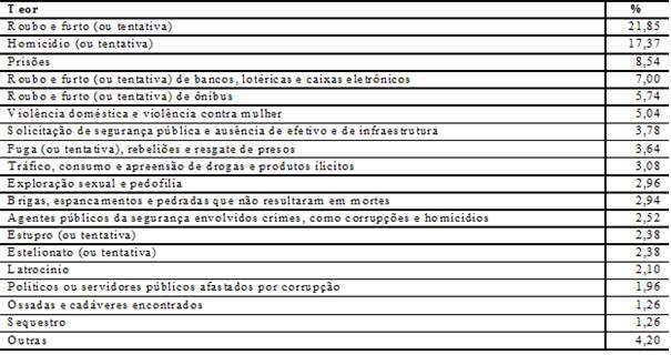 Os roubos, os furtos e os homicídios (ou a tentativa deles) somaram quase 40% de todas as notícias encontradas. Esse patamar passa de 52% considerando-se os roubos e furtos (ou tentativas) de bancos, lotéricas, caixas eletrônicos e ônibus. A violência doméstica, incluindo a contra a mulher, apareceu com 5% das reportagens e o tráfico, consumo e apreensões de drogas ou produtos ilícitos com 3%. Portanto, articulando os resultados expostos nesta parte, é possível perceber que a percepção de Benevides (1983), quanto à divulgação cotidiana de noticiários de violência e criminalidade por parte da mídia se mantem desde a década de 1980. A diferença é que tal situação ultrapassou as barreiras metropolitanas e tem atingindo, cada vez mais, espaços não metropolitanos, sobretudo das pequenas cidades.