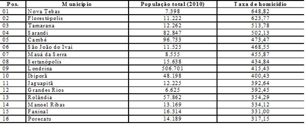 A Tabela 3 lista os municípios que possuem as maiores taxas de homicídios na região Norte Central paranaense, para cada grupo de cem mil habitantes, no período de 1996 a 2013, sendo que todos apresentaram indicadores com, no mínimo, o dobro do tolerado pela ONU para o período.
