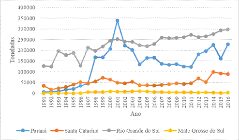 Como se pode observar na Figura 2, a partir dos dados do IBGE (2016), os estados do Rio Grande do Sul e Paraná protagonizam a produção de erva-mate brasileira. No ano de 2001 o Paraná alcançou sua maior produção no período analisado, com aproximadamente 339.139 toneladas de erva-mate. Em 2016, a produção do estado paranaense foi de 227.804 toneladas, enquanto do Rio Grande do Sul foi de 297.141 toneladas.