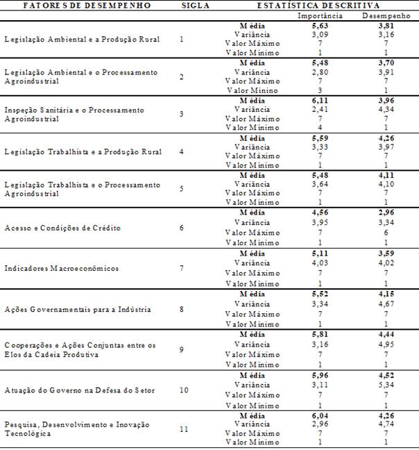A variância, em relação a estes mesmos fatores, apresentou-se maior em relação ao grau de desempenho, chegando a 5,34 no fator referente a atuação do governo na defesa do setor (10). Em relação ao valor máximo, todos os fatores apresentaram o valor máximo de 7 pontos tanto para importância como para desempenho e valor mínimo de 1 ponto, representando alta discrepância entre os dados obtidos nos questionários.