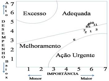 Os fatores (8), (5), (4), (9), (10) e (11), os quais estão alocados na zona adequada, possuem o valor da média da importância e o valor da média do desempenho proporcional, sendo assim, não necessitam de ações para o seu melhoramento. Dos valores obtidos das médias do grau de importância, o fator (11) obteve o maior valor, que foi igual a 6,04, já em relação ao grau de desempenho, o valor mais baixo da média foi igual a 4,11, o que demonstra um equilíbrio entre a importância destes valores e o grau de desempenho apontado pelos respondentes.