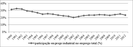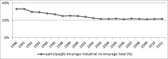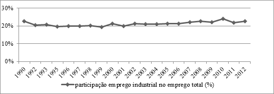 Conforme a figura 4[9], a participação relativa do emprego industrial no emprego total também apresentou uma mudança pequena, variando entre 19,2% e 22% ao longo do período; apresentando tendência à queda entre 1995 e 1999 e, a partir de 2000, com exceção dos anos de 2009 e 2011, a tendência apresentada foi de crescimento.