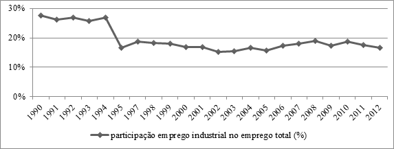 Neste contexto, de 1990 a 1994 a participação relativa da indústria no PIB se manteve estável a cerca de 31,5%. O emprego industrial no emprego total e o valor adicionado da indústria de transformação no produto industrial se reduziram respectivamente em pouco mais de 3% (Figura 5). Já entre 1995-2002, houve uma relativa manutenção da participação indústria no PIB, mas a indústria de transformação no produto industrial deteriorou 3% (WOLD BANK, 2016).