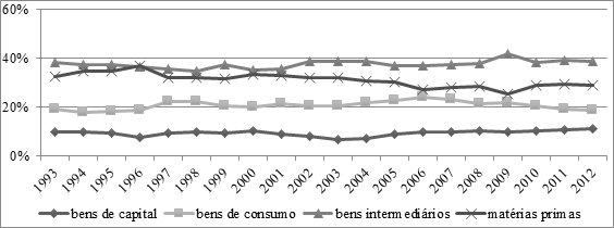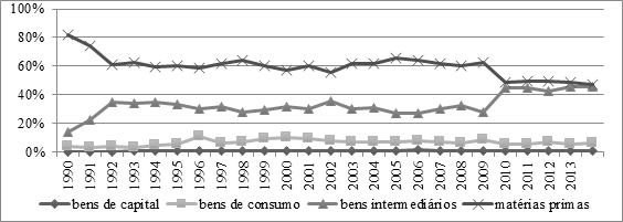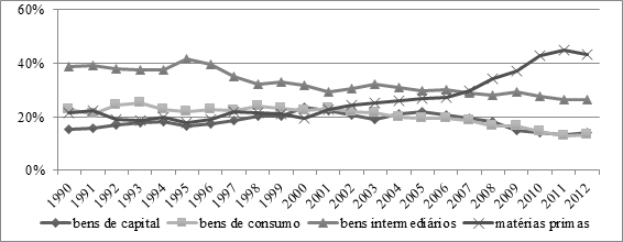 Na década de 1990 não se pode dizer que houve reprimarização de exportações, a participação das matérias-primas se manteve em torno de uma média e as de bens de capital expandiram-se levemente. Por outro lado, os dados sugerem o processo de “reprimarização da pauta de exportações” a partir de 2000, porque bens primários ganharam participação enquanto as dos bens de capital e consumo declinaram.
