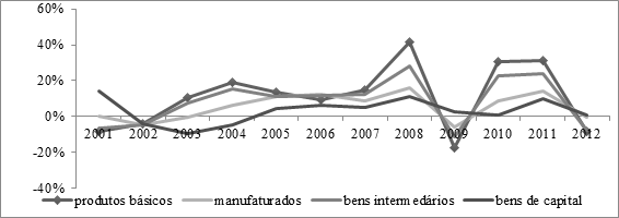 Tais fatos revelados pelos dados corroboram a afirmação de Schwartsman (2009) de que a redução da participação de bens manufaturados na pauta exportadora se deu não pela diminuição da exportação destes, mas pelo aumento das exportações de bens primários devido à elevação dos preços internacionais das commodities; pois, como já salientado, a variação da participação de matérias primas foi mais acentuada (em torno de trinta pontos percentuais) se comparada com a dos outros grupos (em torno de quinze pontos percentuais).