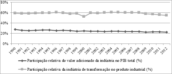 Em suma, durante todo o período, atravessando as décadas de 1990 e 2000, a participação da indústria no PIB tem leve e persistente queda. Na década de 1990 as participações da indústria de transformação no produto industrial e do emprego industrial no emprego total se mantêm, contudo de 2003 a 2008 há alguma reversão desses dois indicadores, pois essas relações elevam-se timidamente. Tendo esses indicadores em vista, apenas a participação da indústria do PIB sugere desindustrialização, enquanto os outros dois não vão ao mesmo sentido.