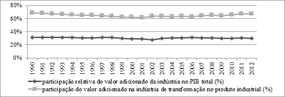 No que diz respeito à participação relativa do valor adicionado da indústria no PIB total, esta apresentou uma tendência de queda leve no período de 28% para em torno de 25% no final da década de 1990, já nos anos 2000 a queda persistiu de forma lenta chegando aos últimos anos da série a uma participação de 23%. Quanto à participação relativa da indústria de transformação no produto industrial, manteve-se na maior parte do período, mas apresentou tendência de queda relevante em momentos de crises: entre 1999 e 2000 um recuo de aproximadamente 6% e entre 2008 e 2012 houve um recuo de aproximadamente 5%, conforme Figura 3.