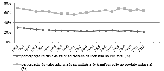 De modo singular, entre 2008 e 2012 a participação da indústria de transformação no PIB industrial sofre uma abrupta queda de mais de 5% e houve uma continuidade da reprimarização da pauta de exportações iniciada na década de 2000.