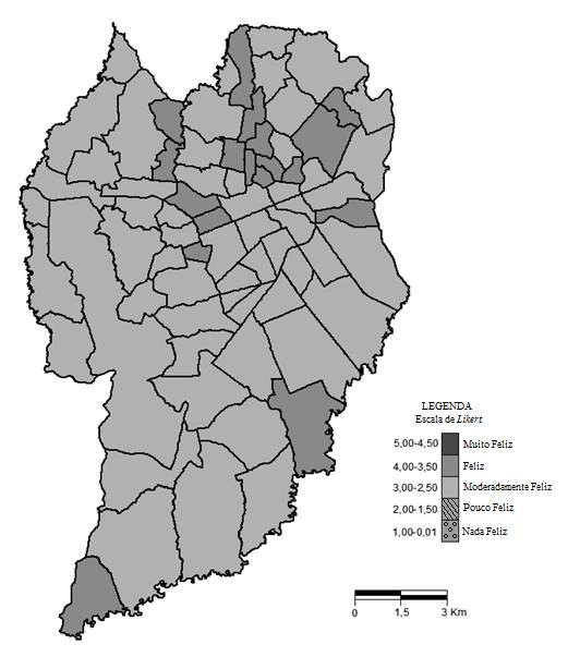 Outro ponto a ser levantado é que embora nenhum bairro tenha atingido o nível máximo pela classificação de Likert, nenhum deles foi classificado como “pouco feliz” ou “nada feliz”. Ao considerar os bairros separadamente, avaliam-se as localidades com as maiores médias, sendo Cascatinha (3,67), Centro Cívico (3,65), Juvevê (3,63), Capão da Imbuia (3,62) e Alto da Glória (3,61). Os bairros com as médias mais baixas foram Cachoeira (2,94), Augusta e São Miguel (2,97 cada), Atuba (3,01), Prado Velho (3,05) e Ganchinho (3,15).