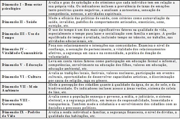 O indicador de Felicidade Interna Bruta (FIB) é um projeto da Organização das Nações Unidas (ONU), o qual foi criado com a visão de se medir a felicidade da população como forma de desenvolvimento. O questionário original do FIB constitui 249 questões relacionadas com nove dimensões: bem-estar psicológico, saúde, uso do tempo, vitalidade comunitária, educação, cultura, meio ambiente, governança e padrão de vida, como é apresentado no Quadro 1. Devido à estrutura do questionário, com perguntas focadas em Butão, anteriormente a aplicação foi necessário selecionar e filtrar as questões mais pertinentes à região em estudo, sendo 14 delas previamente determinadas.