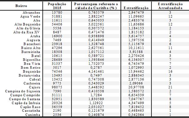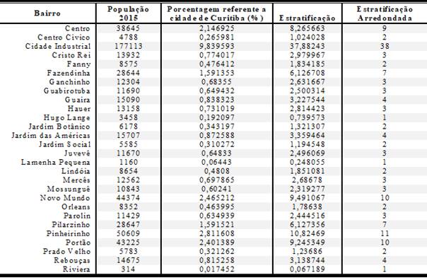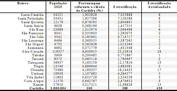 Por isto, foram adotados 5% de erro e 95% de confiança, com um total amostral obtido de 385. Contudo, para um resultado proporcional, foi realizada a estratificação entre os bairros da cidade (GIL, 2008), procedendo também com o arredondamento para números inteiros, totalizando em 425 questionários. A Tabela 1 (a, b e c) apresenta a estratificação realizada nos bairros da cidade de Curitiba.