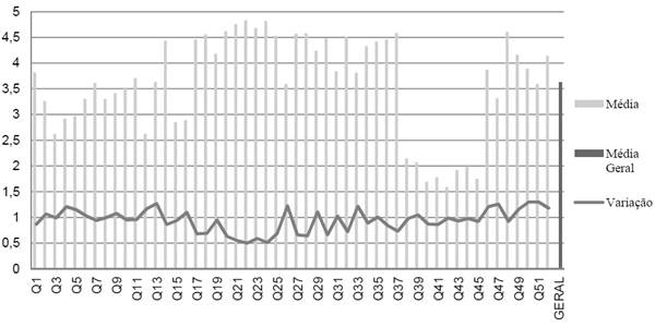 A média de variação das respostas entre os entrevistados foi de 6,04%. As maiores variâncias se deram nos assuntos relacionados ao combate à corrupção (Q42), melhoria na energia elétrica (Q45), melhorias educacionais (Q40) e redução da distância entre ricos e pobres (Q39), com 61,98%, 52,64%, 51,14% e 50,51% respectivamente. As menores variações estão relacionadas com respeito aos pais (Q22), honestidade (Q24), respeito pelos mais velhos (Q21) e disciplina (Q23), com 10,44%, 10,64%, 11,49% e 12,58% respectivamente (GRÁFICO 2).