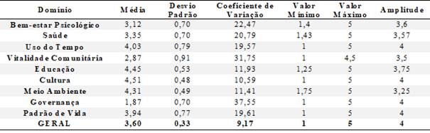 A média por domínios variou de 1,87 a 4,51. O domínio da governança apresentou o menor resultado, com 1,87. Ele aborda questões sobre criação de empregos, melhorias educacionais, combate à corrupção, proteção do meio ambiente e melhorias em estradas. O segundo menor resultado se deu no domínio vitalidade comunitária com 2,87. Tal domínio considera questões sobre confiança nas pessoas da cidade e nos vizinhos. O bem-estar psicológico (3,12) trata de questões sobre autoavaliação da felicidade, ajuda quando se está doente, problemas financeiros ou emocionais e estresse. O domínio da saúde (3,35) apresenta questões sobre satisfação com a competência da equipe médica, limpeza e tratamento médico prescrito, e da dificuldade em relação à distância do hospital, transporte e tempo de espera para ver o médico. O padrão de vida apresentou média de 3,94. Ele considera a compra de roupas de segunda mão para manter custos baixos, inadimplência de empréstimos e aluguéis, dificuldade de apoio financeiro dos familiares e equipamentos que foram vendidos para aumentar o dinheiro das despesas básicas.